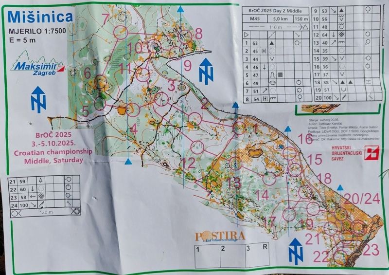 Prvenstvo Hrvatske na srednje staze za sve natjecateljske kategorije osim za seniore održano je danas na novoj karti Mišnica na Braču na samom vrhu Vidove gore. Za razliku od jučerašnjeg burovitog i hladnog dana, danas nas je dočekao prekrasan sunčani i topli dan. Tehnički vrlo zahtjevan teren iziskivao je puno koncentracije na kartu i svaka greška skupo se plaćala. Vremena pobjednika su bila nešto duža od planiranoga.