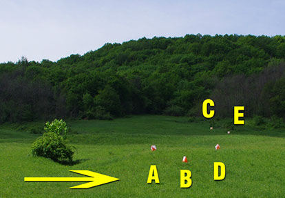 Na karti natjecatelj vidi samo jednu kružnicu koja označava neko obilježje na terenu, a na terenu se nalazi jedna ili više zastavica - A,B,C,D,E,(F).